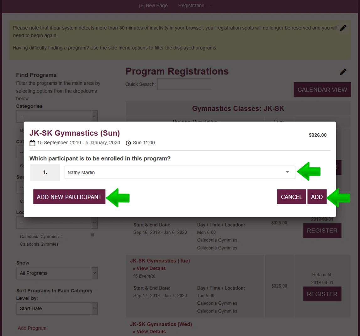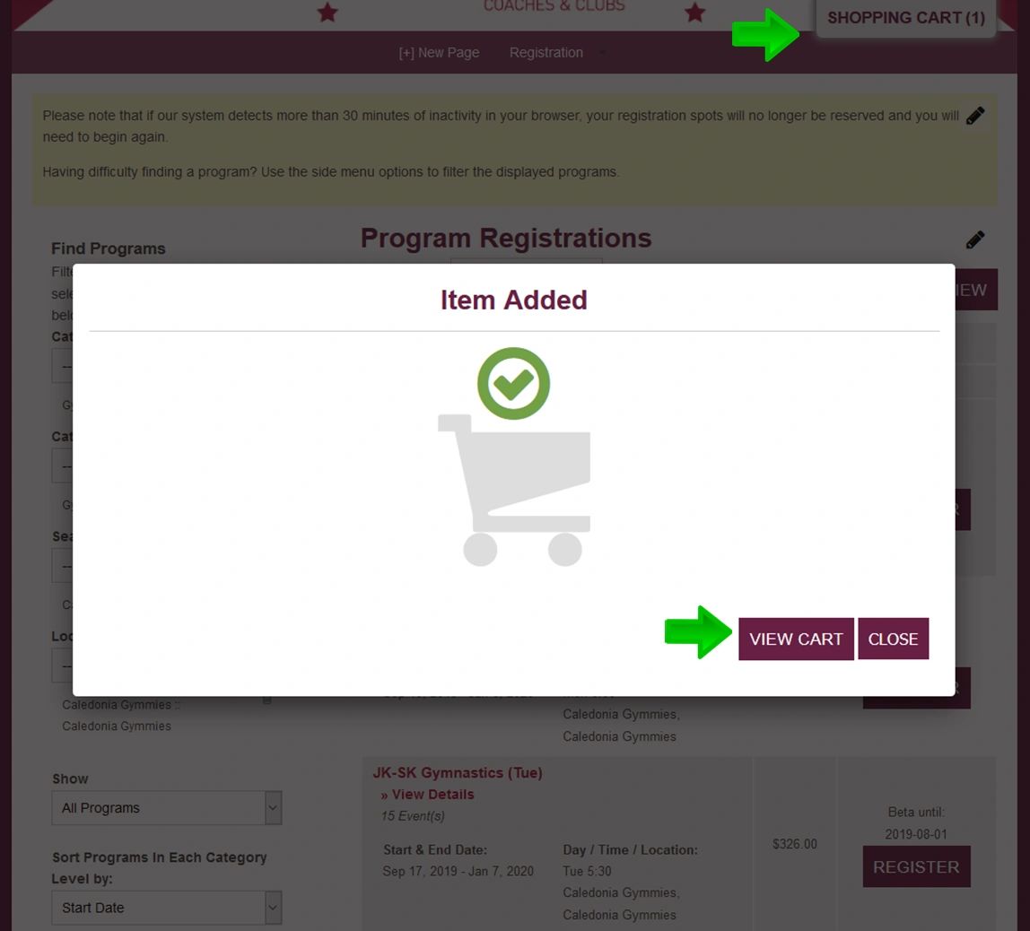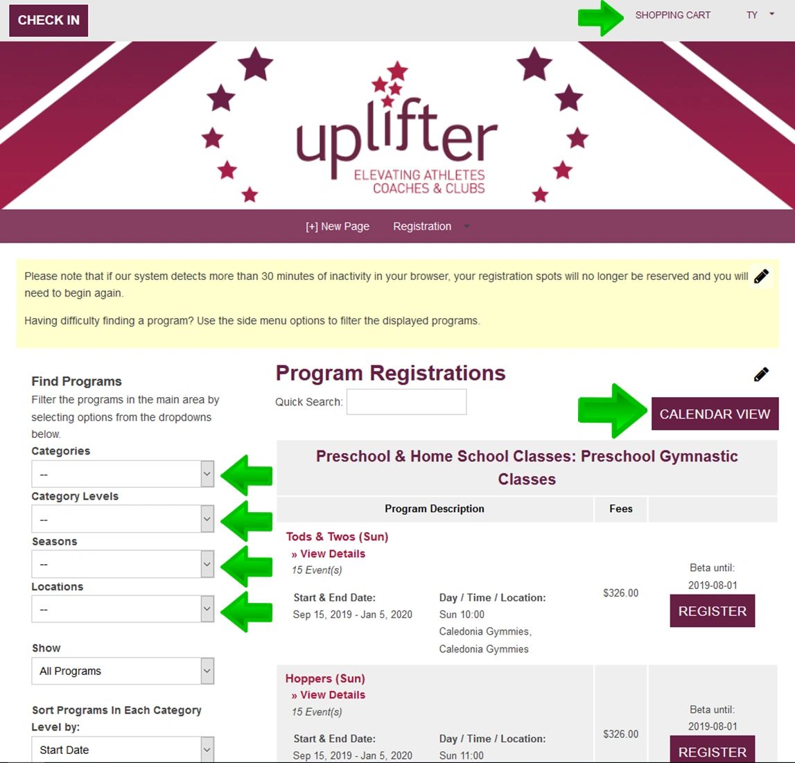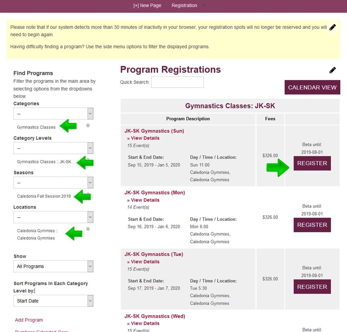 Click "Registration" or "ONLINE REGISTRATION button to begin viewing programs for registration