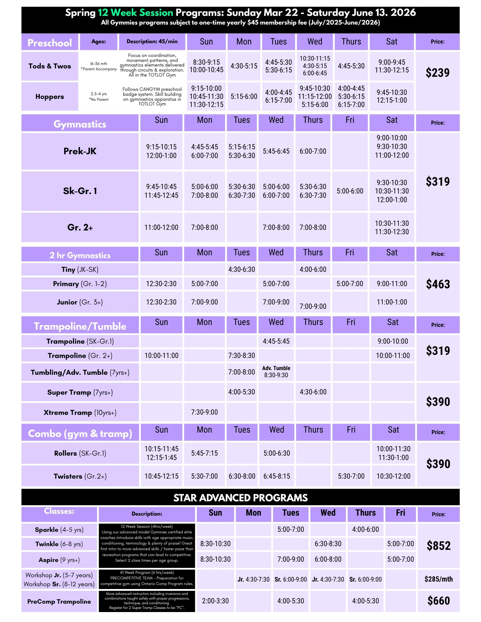 *Classes subject to $45 Membership fee July - June Gymmies most popular! Combine 2 events into 1 class! 30 min tramp, 1 hr gymnastics. All follow Can Gym Fed progressive gym, tramp. tumbling badge program. Held in Main gym or *Rec room.