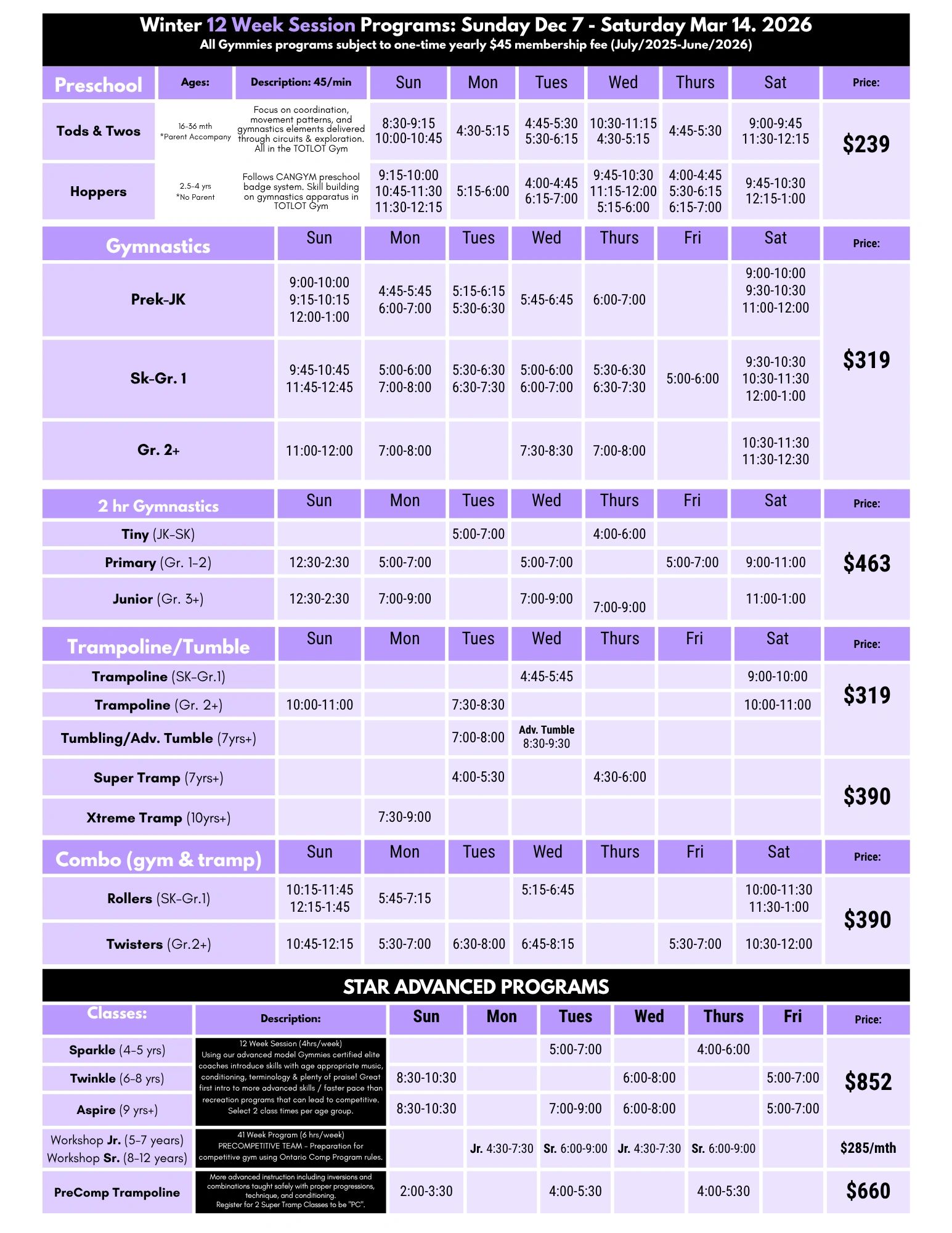 *Classes subject to $45 Membership fee July - June All class settings are a progressive learning environments following the CANGYM badge system